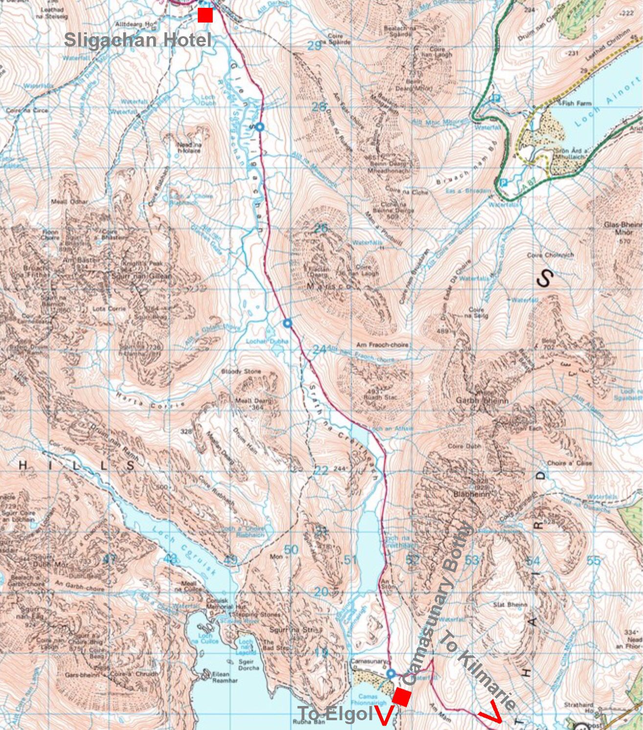 The Bothy can be reached from Elgol via the coast path (approx 2hours), from Sligahan via the path that runs down Sligachan Glen (approx 3 hrs) or from the car park at Kilmarie via a rough Landrover track (approx 1.5 hrs).