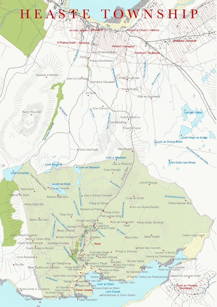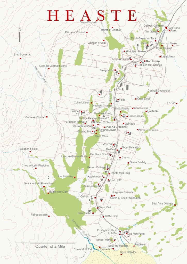 It was over a whisky at New Year 2017 that the idea of creating a map of the Gaelic place names of Heaste, a small crofting settlement in the south of Skye, was hatched. I learnt from Ali MacPherson, the Clerk of the Common Grazing, that the Gaelic names of the landscape features surrounding the township of Heaste had been passed down from generation to generation through an oral tradition, but they had never been written down. Ali was fearful that the names might be lost because crofting was dying out and therefore there was no longer a need for people to name the features of their immediate landscape. Over the period of a year I worked with local residents to map the gaelic place-names and with a Gaelic specialist. The result was two maps, one of the township and one of the settlement.
