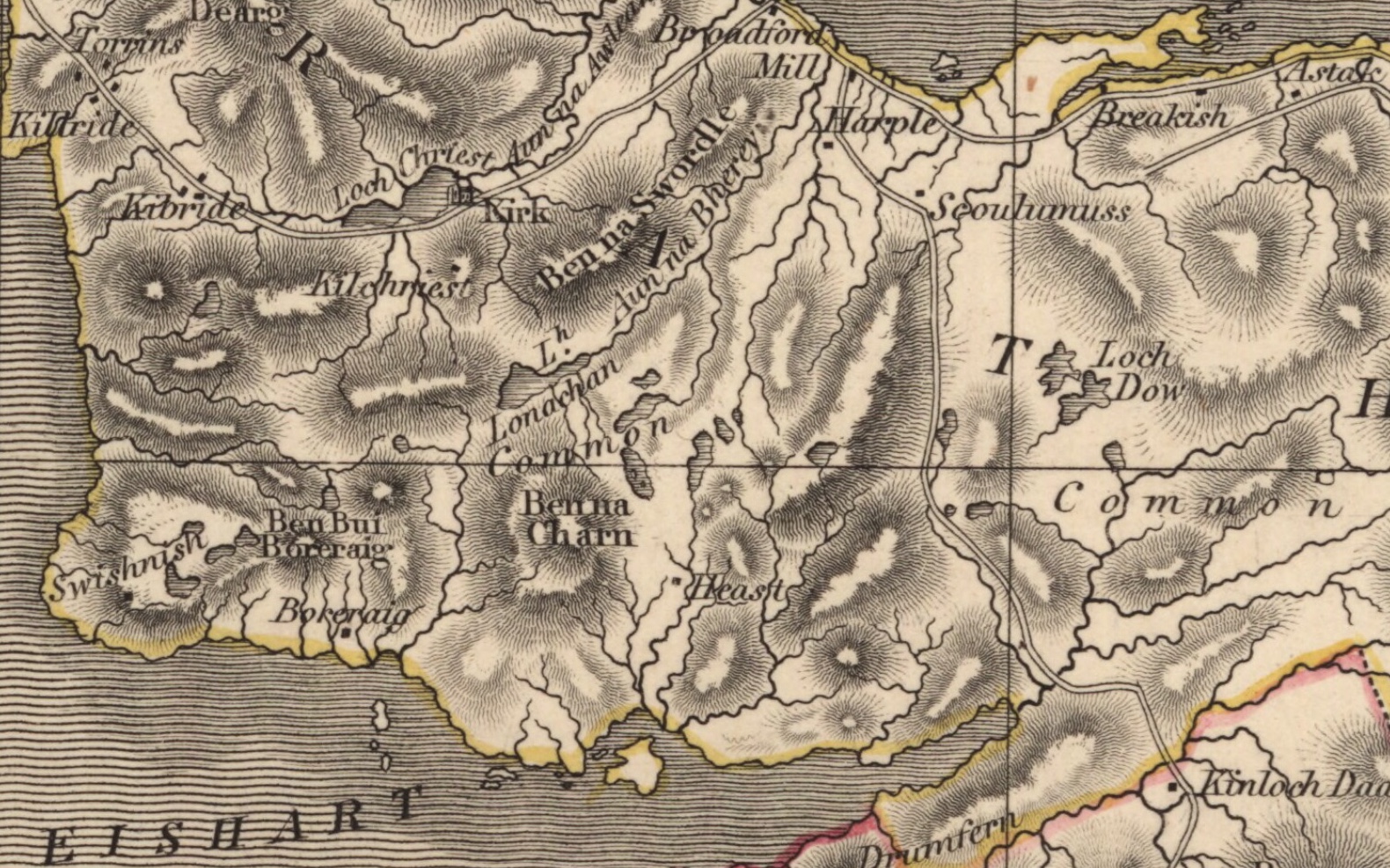 Despite the large population living in Heaste in the early to mid nineteenth century neither Johnson’s or Thompson’s contemporaneous maps show a road running from Heaste to Broadford even though their maps show a road from Broadford to Torrin and Elgol, which were similar in size to Heaste (Figures. 15, 16). There would almost definitely have been an track from Broadford to Heaste although people used to moving around the island by boat because their were so few roads. Dr Johnson’s late eighteenth century account of his journey around the Hebrides with James Boswell records that they travelled regularly by boat rather than by mule because of the poor road conditions (Johnson, 1775 ) and Flora-Anne MacLeod, a contemporary Heaste resident, recollects regularly travelling by boat from Heaste to Kinloch as a child in the 1940s. A road from Broadford to Heaste was finally built in 1886 and the tenants of Heaste contributed 180 days of work towards its construction (The Museum of the Isles; GD221/3225/2/2). At the time there was much controversy about the route that the new road should take. The crofters of Harrapool protested that the line of the new road was through their best grazing land and the crofters from Heaste withheld their labour until their preferred route was approved.