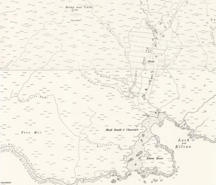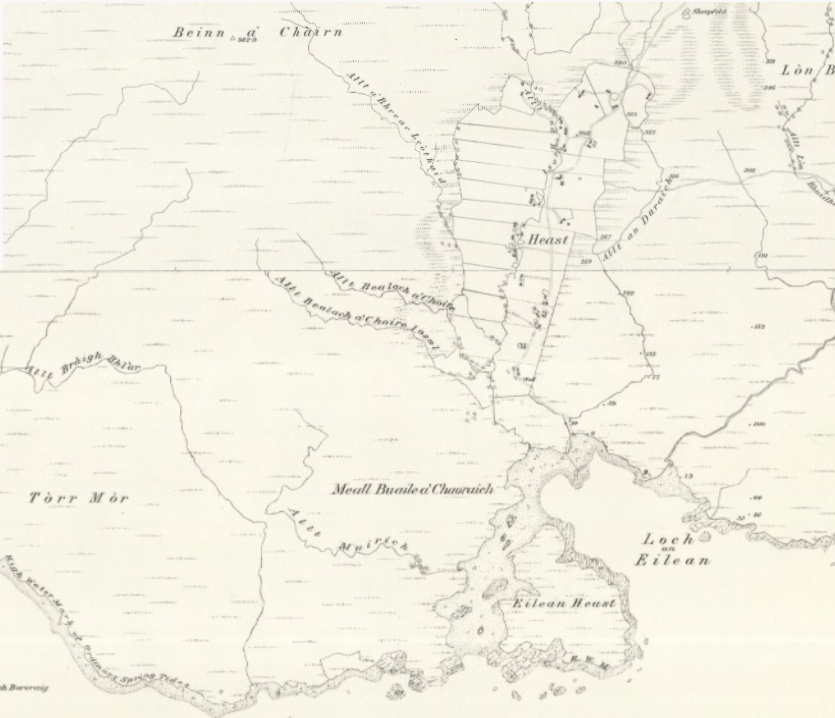 The first series of six inches to the mile Ordnance Survey maps of England, Scotland and Wales were begun in the 1840s. The Isle of Skye was surveyed in 1876 and the first maps were published in 1881. The map covering Heaste shows a great deal of detail including every building, boundary and water course. The layout of the thirteen crofts, which ran west-east and were bisected by the track running north-south running parallel to the burn Allt na Heaste, can clearly be seen.