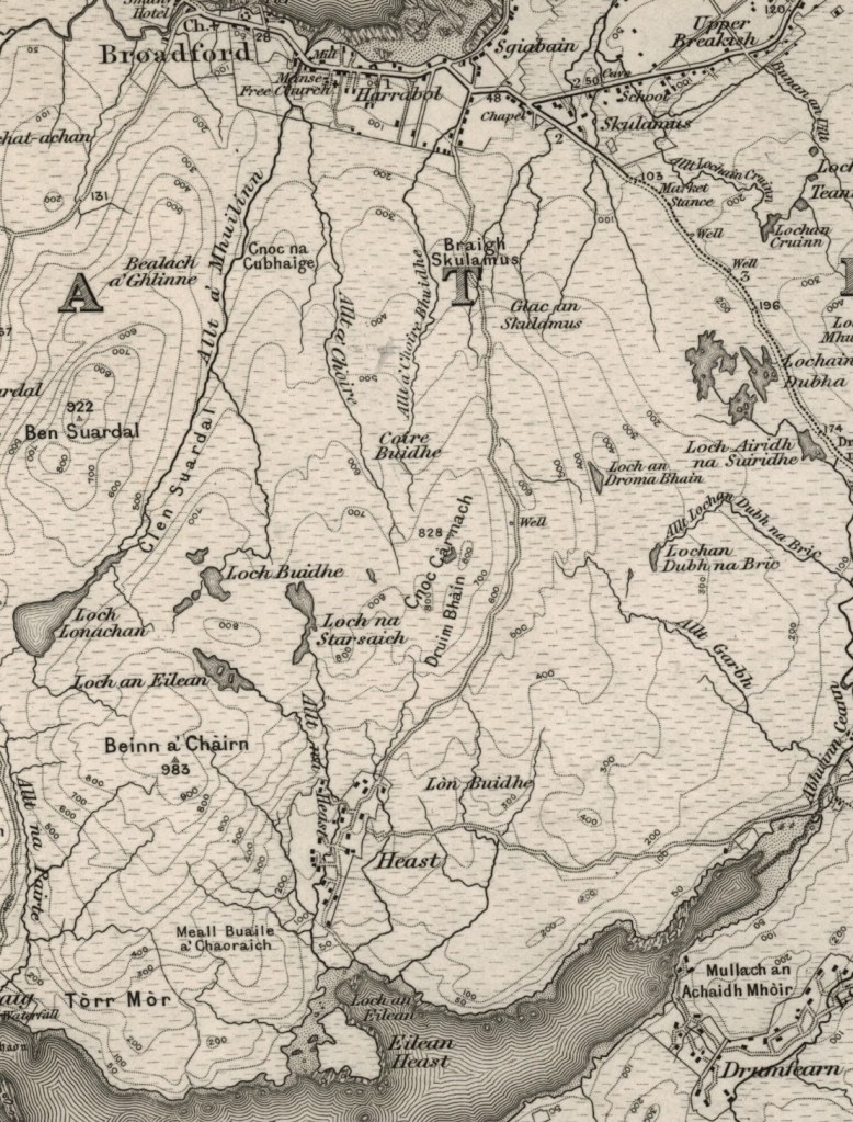 Malcolm MacInnes’s testimony demonstrates that small size of the crofts in Heaste, between three and six acres, continued to cause problems for the crofters in 1884, despite the population having dropped to approximately half of its peak population of 229 in 1841. MacInnes explains how the constant crop rotations was depleating the nutritional value of the soil. In addition to working their crofts crofters had grazing rights, ‘summings’, for the common grazing land. The ‘summings’ were related to the size of the Croft. MacInnes cites the summings, presumably for his six acre Croft, to be ‘five sheep, twenty four sheep and a pair of horses’, but that his Croft could not produce adequate food for them. In his testimony MacInnes also complains that an additional unjust financial burden called ‘drainage monies’ which were ‘laid upon us’. This probably refers to the requirement for crofters to pay back loans that they received during the potatoes famine to improve their land. MacInnes also reported that their potato crop failed again in 1883. Given that potatoes were the staple food for crofters and their families a failing crop would have caused much hardship. MacInnes also reports that there was no road from Broadford to Heaste however we know from the Ordnance Survey Map 1 inch edition that a road had been built by 1885. The line of the road from Braigh Skulamus to Broadford changed sometime between 1908 am during ,according to the Ordnance Survey maps, and now runs down from Braigh Skulumas past the old Broadford free church.