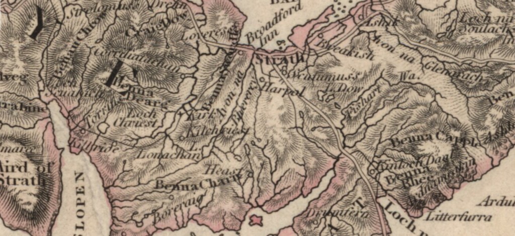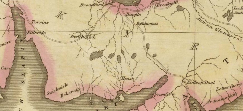 John Sinclair followed up his 1793 Statistical Account of Scotland with a second acccount in 1845. Sinclair hoped that the new survey would demonstrate the social, cultural and economic improvements that had occurred in the interim fifty-two years. The 1845 account for the parish Strath was written in April 1840 by the Rev. Alexander McIvor, Minister for the presbytery of Skye, which was in the Synod of Glenelg. McIvor’s account is the first detailed description of life in the parish following the implementation of John Blackadder’s 1811 plan for reorganising the Macdonald Estate and the replacement of organic settlements and the associated run-rig system of agriculture with crofting townships circa 1811. In his view reorganisation had been a success;