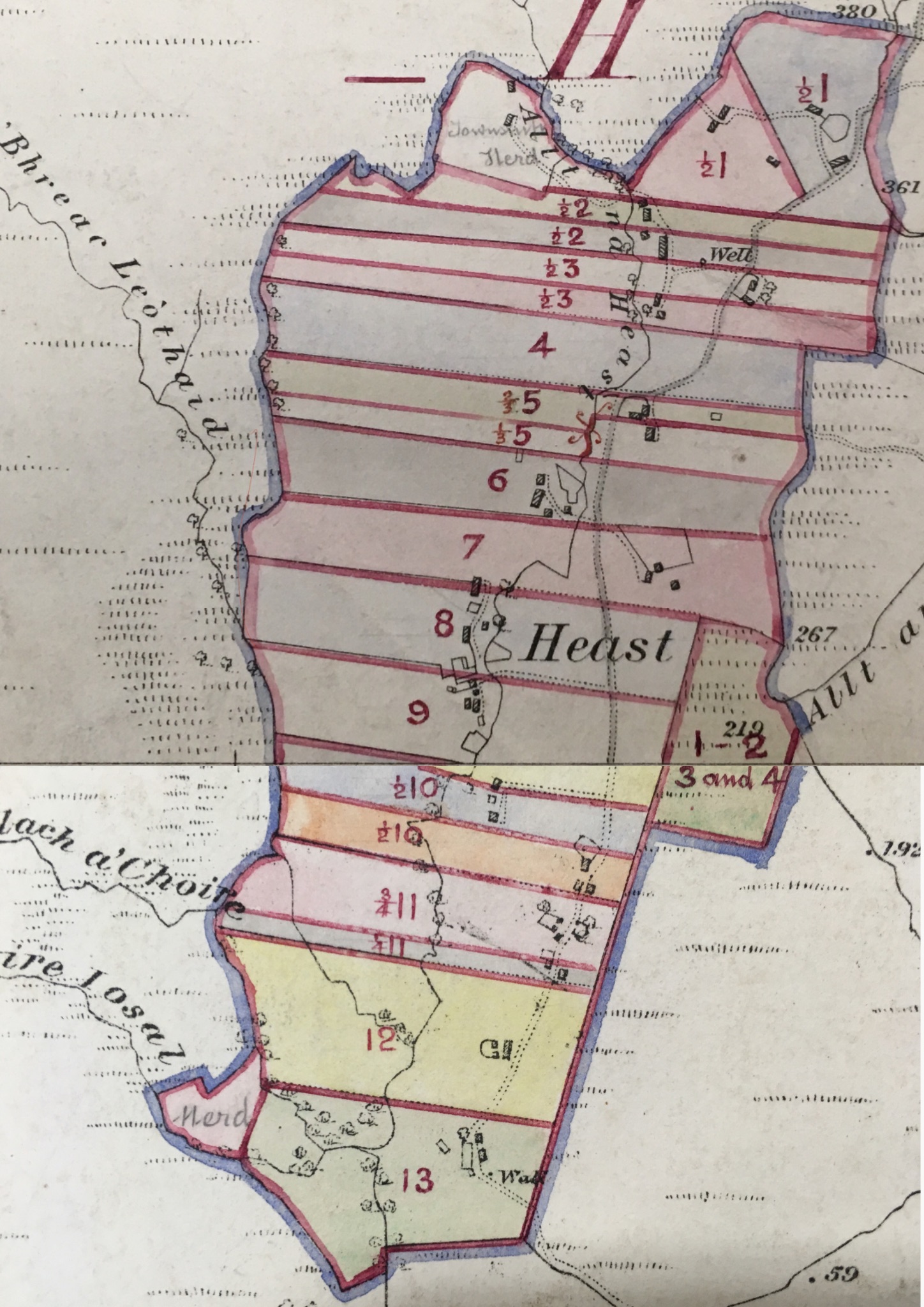 Blackadder’s map (Figure 9.), which is held at The Museum of the Isles Library and Archive, Armadale Castle (5998/3), shows the thirteen proposed crofts running east-west with the stream Alt na Heaste running north-south through the crofts to Loch Eishort at the bottom of the map. Blackadder proposed that the new crofting township should be almost identical in size and location to the pre-crofting Club Farm (Figure 9a).