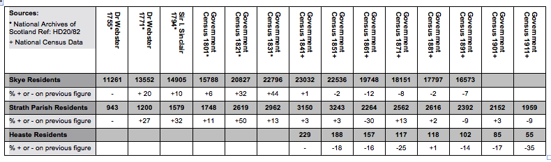 Over the next twenty’s years McIvor’s cure to the destitution problem, a reduction the the population of was realised albeit not through emigration. The peak populations for Skye, Strath and Heaste occurred around the mid nineteenth century and thereafter the population numbers fell dramatically . By 1871 the number of households in Heaste had reduced from 42 to 25 and the population had reduced from 229 to 117, a drop of nearly fifty percent (source: Census data). The exodus was largely from those living outwidth the crofts i.e.the cotters. In 1871 there was only one household that was not housed on a croft.