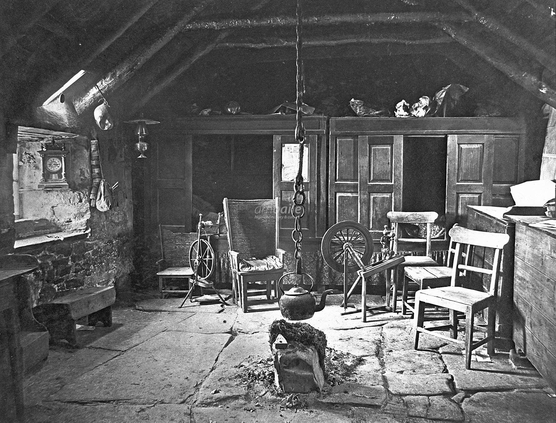 Peat continued to be the main fuel source which was ‘secured at a season of the year when there is a cessation from all other labour’ (p313). Figure 20c shows a peat fire in the centre of the room and two box beds against the far wall.