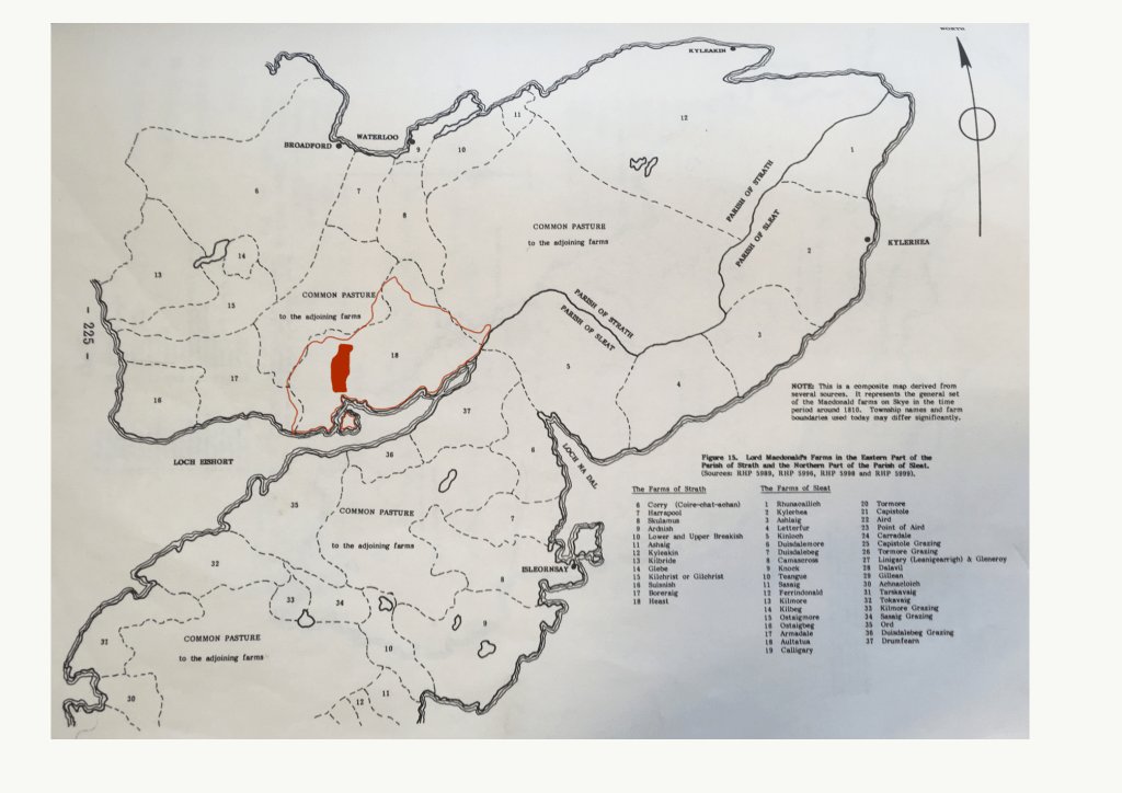 Blackadder’s report assessed all the existing land use and settlements on Skye for their potential to be converted into either large single tenant sheep farms or crofting settlements. It would be the large sheep farms that would command highlands rents for Lord MacDonald. The laying out of crofting townships was seen as a way of moving existing small tenants from the good sheep grazing areas and providing Lord MacDonald with a good supply of labour for his estate, including the harvesting of Kelp. However, in the Parish of Strath Blackadder did not suggest and wholesale removal of any exIsting settlements. Instead he recommended that existing settlement be turned into crofting settlements i.e. abandonment of small tenant club farms and the allocation of small contiguous parcels of land, around six acres, to individual tenants. Curiously Blackadder’s valuation of Heaste was £70 per quarter. (£280 per annum) which is far above the £150 that the small tenants we’re paying in 1800. When the crofts were eventually laid out in 1811 the new crofters paid £155, 11 in rent per annum.