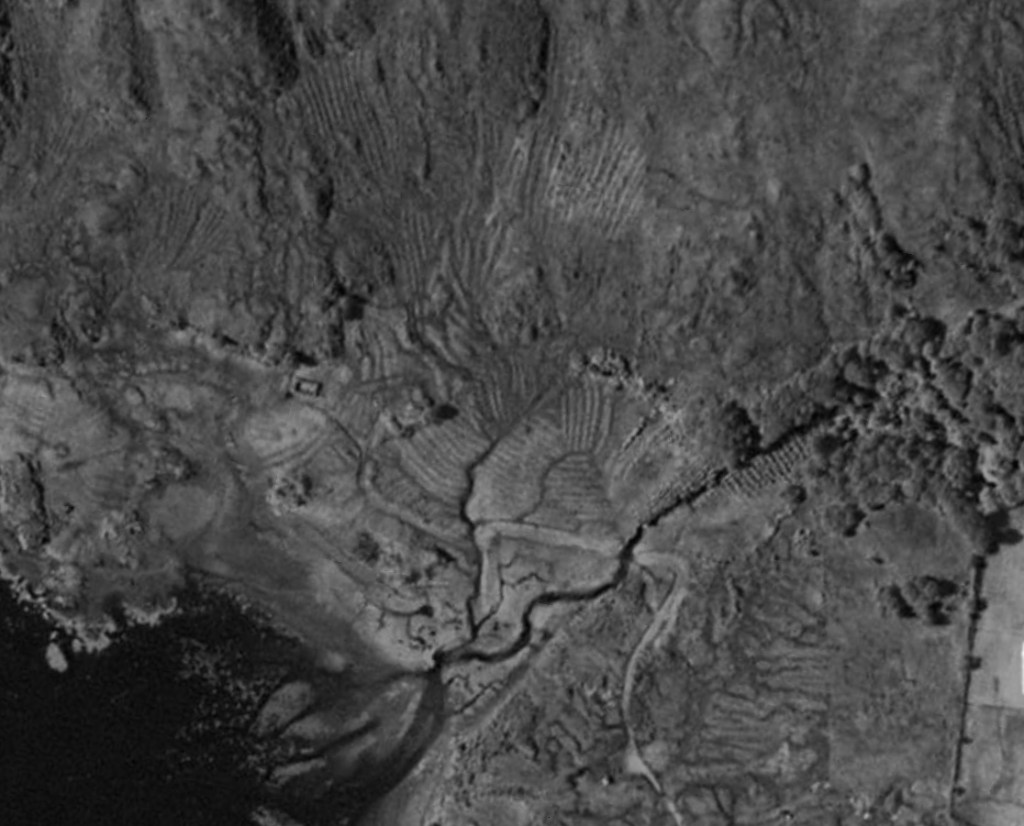 Mathew Stobie’s map (Figure 5,6.) shows Heaste in the bottom left hand corner. The extract (Figure 6.) clearly indicates, as parallel lines, the extent of the rig and furrow agricultural system in Heaste. However, both the Canmore archeological map (Figure 2.) and contemporary aerial photographs (Figure. 7.) suggest that the area of rig and furrow was considerably more extensive than Stobie’s map suggested.