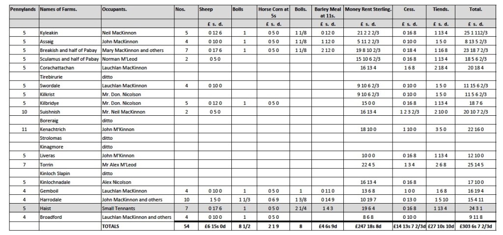 Ian Mackinnon has written an extensive history of Strath during the eighteenth and nineteenth centuries in which he recounts the early ownership of Strath, the parish within which Heaste sits (MacKinnon, 1975-). The lands of the Parish of Strath was thought to be the property of the MacKinnon clan as far back as 1354. During the early part of the eighteenth century Strath was owned by Ian Dubh, 29th Chief of the barony of Mackinnon. Strath was forfeited after the 1715 Risings. However, in 1728 the lands were conveyed to Ian Dubh’s heir, John Mackinnon and then in 1738 to John Mishnish, the chief’s half brother. By the middle of the century the estate was so overburdened by debt that in 1751 the greater, southern, part of the estate, including Heaste, was sold to John MacKenzie of Devlin and quickly sold on to the trustees of Sir James MacDonald, then a minor, in 1760. Subsequently the northern parts of the estate were were was sold off; Mishnish in 1774 and Strathaird in 1774. Strathaird was purchased for £8,400 by Alexander MacAlister of Skirinish, who originally came from Loup, Argyll’s. The record of rents from 1751 (Figure 3.) suggest that Heaste was the only farm out of the twenty three farms on the MacKenzie estate to be rented to a group of ‘small tenants’ rather than single tenant farmers. During the eighteenth century landlords moved away from renting farms to groups of tenants in favour of single tentants, who might then lease land to sub tenants or employ farm workers, because single tenants were perceived as being more reliable. The size and rent charged for the Heaste, 5 penny lands at £24 3s 1d, appears to be similair to many of the other farms . A Penny land was a measure of land. It is interesting to note that only part of the rents were due as a cash payment. Rents were also made up of sheep, grain, whose monetary value was included in the rent book. Rents also included amounts for ‘cess’, a local property tax introduced in 1665, and ‘Tiends’, a tax for the ministers upkeep. The payment of rent partially in tythes was gradually replaced by payment exclusively in cash as commerce gradually replaced exchange over the course of the 18th century. This change reflected the way that the tenants honour based relationship to their clan chief was replaced by a more legally based contract with a land owner or laird.